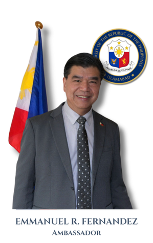 Dr. Emmanuel R. Fernandez is a career diplomat of the Republic of the Philippines. Prior to his assignment as Philippine Ambassador to the Islamic Republic of Pakistan, he was the Deputy Chief of Mission and Consul General of the Philippine Embassy to Singapore. He had also served as the Deputy Chief of Mission and Consul General of the Philippine Embassy to the Kingdom of Spain; First Secretary and Consul General of the Philippine Embassy to the Hashemite Kingdom of Jordan; and Second Secretary and Consul of the Philippine Embassy to the Italian Republic.